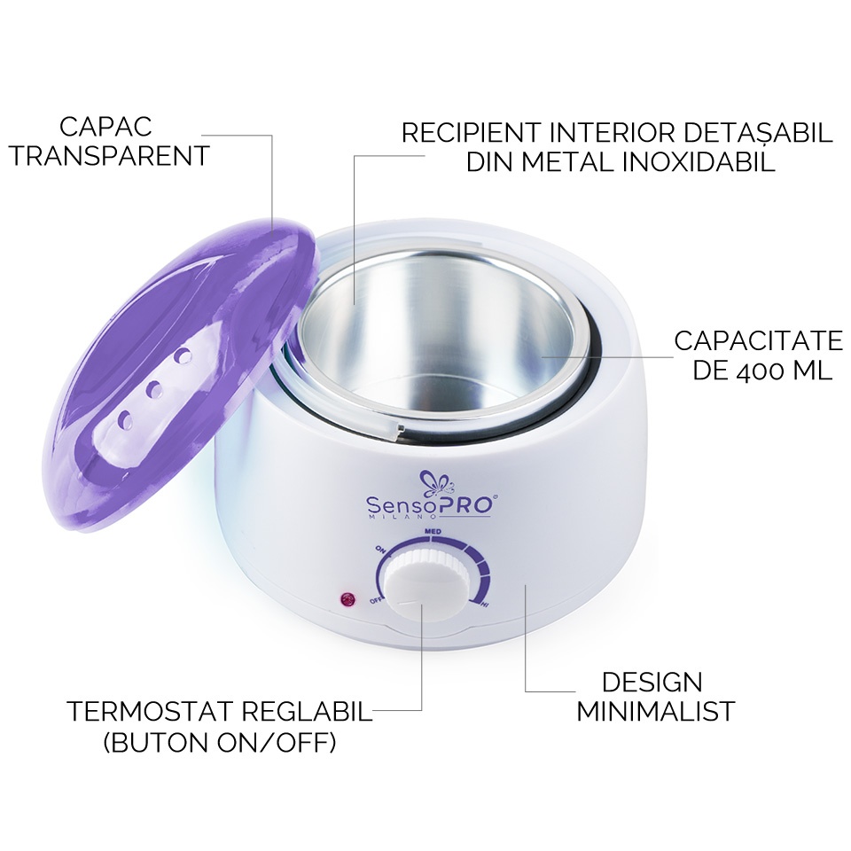 Decantor Ceara Traditionala - Incalzitor Ceara / Parafina Pro Wax 100 SensoPRO Milano pentru ceara si parafina Pro-Wax 100, cu o capacitate de 500 ml, este solutia perfecta pentru un epilat rapid si usor. Se poate utiliza si pentru obtinerea beneficiilor tratamentului cu parafina. Topeste toate tipurile de ceara traditionala, dispune de recipient interior detasabil din metal si termostat reglabil. Pachetul contine: 1buc x Incalzitor ceara electric 1buc x Manual de utilizare Specificatii: Model: SP-PROWAX 100 Capacitate: 500ml Tensiune alimentare: 220-240V 50Hz Material: ABS & Aluminiu Culoare: Alb Respectati intotdeauna modul de utilizare. Mod de utilizare: Epilare cu ceara: 1. Asaza incalzitorul pe o suprafata dreapta si rezistenta la temperatura; 2. Asigura-te ca rotita incalzitorului este pe pozitia OFF, apoi conecteaza incalzitorul la priza; 3. Toarna cantitatea de ceara dorita in recipientul incalzitorului si pune capacul; 4. Seteaza incalzitorul la temperatura maxima cu ajutorul rotitei si încalzeste ceara pana devine complet lichida, apoi pastreaz-o constant la o temperatura medie. Amesteca din cand in cand pentru a verifica soliditatea, ceara este gata de aplicare cand devine cremoasa ( supravegheati constant ceara in momentul incalzirii). 5. Asigura-te ca temperatura cerii este confortabila pentru pielea ta. Poti face un test pe o mica portiune a pielii pentru a evita arsurile. 6. Incepe prin curatarea pielii cu Lotiunea înainte de Epilare SensoPRO Milano . Asigura-te ca pielea este complet uscata inainte de aplicarea cerii. 7. Foloseste o spatula pentru a aplica ceara in directia cresterii firelor de par, asteapta cateva secunde pentru a se întari ceara si apoi trage rapid in sens invers cresterii firelor de par. 8. Aplica Ulei dupa Epilare pentru a indeparta reziduurile de ceara si pentru a reduce roseata si iritatiile pielii. Evita expunerea la soare sau la bai fierbinti timp de cateva ore dupa epilare pentru a preveni iritatiile suplimentare. 9. Dupa utilizare, deconecteaza incalzitorul de la priza si curata-l pentru a indeparta resturile de ceara cazute pe acesta. Tratament cu parafina: 1. Asaza încalzitorul pe o suprafata dreapta si rezistenta la temperatura; 2. Asigura-te ca rotita incalzitorului este pe pozitia OFF, apoi conecteaza incalzitorul la priza. 3. Portioneaza parafina si asaza cantitatea dorita în recipientul încalzitorului, apoi pune capacul. 4. Seteaza incalzitorul la temperatura maxima cu ajutorul rotitei si incalzeste parafina pana cand aceasta devine complet lichida, apoi seteaza încalzitorul la temperatura medie si astepta ca temperatura parafinei sa fie confortabila pentru pielea ta. Poti face un test pe o mica portiune a pielii pentru a evita arsurile ( supravegheati constant ceara in momentul incalzirii). 5. Inainte de aplicarea parafinei trebuie sa: dezinfectezi zona dorita, sa masezi usor cu o crema exfolianta si sa clatesti cu apa calduta, apoi aplica un strat gros de crema hidratanta si maseaza usor. 6. Cand parafina ajunge la temperatura dorita, aplica pe zona dorita cu o pensula/spatula speciala pentru parafina. 7. Dupa acoperirea completa cu parafina, introdu manile/picioarele mai intai intr-o manusa/soseta de unica folosinta, apoi in manusile/sosetele din bumbac pentru parafina. 8. Asteapta 30min. si îndeparteaza parafina. 9. La final aplica un strat de crema hranitoare și maseaza usor. 10. Curatarea incalzitorului se face cu ajutorul unui servetel, cat timp parafina este înca lichida. Ceara si parafina se folosesc exclusiv pentru uz extern. A nu se aplica pe piele sensibila, afectata de leziuni sau pe zone sensibile. A nu se lasa la indemana copiilor . A se evita supraincalzirea. Se recomanda incalzirea precauta. ATENTIE: foarte fierbinte, poate cauza arsuri! Conditii de pastrare: Nu lasati produsul (ceara sau parafina) deschis si nefolosit pentru perioade mari de timp. A se pastra in spatii reci, uscate si aerisite, ferite de lumina directa a soarelui, a umezelii , a materialelor cu potential agresiv, eventuale lovituri, zgarieturi sau deformari. Se beneficiaza de garantia legala de conformitate asa cum aceasta este reglementata de dispozitiile Legii nr. 296/2004 privind Codul Consumului, cu modificarile si completarile ulterioare coroborate cu dispozitiile OUG nr. 140/2021 privind vanzarea produselor si garantiile asociate acestora, cu modificarile si completarile ulterioare.
