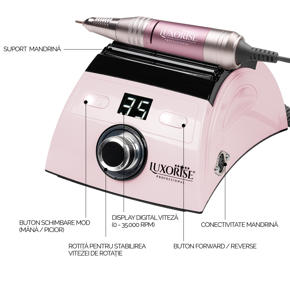 Freza unghii profesionala Energy PRO - LUXORISE , 35.000 RPM, Pink are un design elegant si ergonomic. In acelasi timp, este puternica, silentioasa si usor de folosit. Datorita designului practic, mandrina poate fi asezata direct pe unitatea centrala, in timp ce butonul de schimbare a sensului de rotatie si butonul de control pentru pedala / mana sunt in partea din fata, oferind tehnicianului conditii ideale de optimizare a procesului de pilire. Cu ajutorul butonului rotativ din centrul unitatii, se poate ajusta viteza de rotatie, pe cand display-ul digital ofera informatii asupra vitezei. Freza este recomandata pentru pilire, gravare, slefuire, polizare, ascutire, lustruire si definire a patului unghial, micsorand timpul de lucru si marind eficienta. Unitatea centrala are un design modern si este creata din materiale de cea mai buna calitate. Dispune de sistem de control al vitezei, protectie la suprasarcina si oprire de siguranta. Poate fi actionata atat manual, cat si cu ajutorul pedalei incluse, pentru un mai mare confort in utilizare. Dispozitivul ajunge la o viteza de pana la 35.000 rotatii pe minut si comutator avansat de directie (doua sensuri de rotatie), fiind adecvata atat dreptacilor, cat si stangacilor. Mandrina sa nu vibreaza in timpul utilizarii, este robusta, are greutate optima si varful subtire ce favorizeaza finetea si precizia operarii. Capul de slefuit poate fi inlocuit fara efort datorita sistemului de prindere Twist-Lock cu care este dotata mandrina. Sfaturi utile pentru o folosire indelungata: Cand freza nu este folosita, aveti grija ca aceasta sa fie oprita de la butornul OFF. Nu este suficient ca modul de lucru sa fie dat la 0. Pentru fiecare schimbare a sensului de rotatie setati mai intai viteza de rotatie la 0 apoi apasati butonul de Reverse / Forward. Nu apasati butonul de Reverse / Forward in timpul functionarii. Exista riscul ca mandrina sa se arda. Mod de utilizare: Conectati mandrina in partea dreapta a frezei, apoi conectati freza la priza cu ajutorul alimentatorului. Conectati pedala in partea din spate a frezei, apoi apasati butonul ON/OFF pentru a porni. Pentru a utiliza pedala selectati acest mod apasand butonul FOOT/HAND. Selectati viteza dorita cu ajutorul rotitei, apoi apasati pedala pentru a porni freza. Alegeti sensul de rotatie Forward sau Reverse. Specificatii tehnice: Display Digital Viteza: 35.000 rpm Putere: 65 W Tensiune alimentare: 220-240 V 50Hz Culoare: Roz Model: LUX-4000DX Material: HQ Plastic & Metal Greutate: 1,183 kg Dimensiuni: 20 x 20 x 9.5 cm Sens rotatie FWD / REV Pachetul contine: 1 buc x Pila electrica de unghii 1 buc x Mandrina 1 buc x Pedala 6 buc x Varfuri de polizare 6 buc x Capete de slefuit 1 buc x Manual de utilizare Se beneficiaza de garantia legala de conformitate asa cum aceasta este reglementata de dispozitiile Legii nr. 296/2004 privind Codul Consumului, cu modificarile si completarile ulterioare coroborate cu dispozitiile OUG nr. 140/2021 privind vanzarea produselor si garantiile asociate acestora, cu modificarile si completarile ulterioare.
