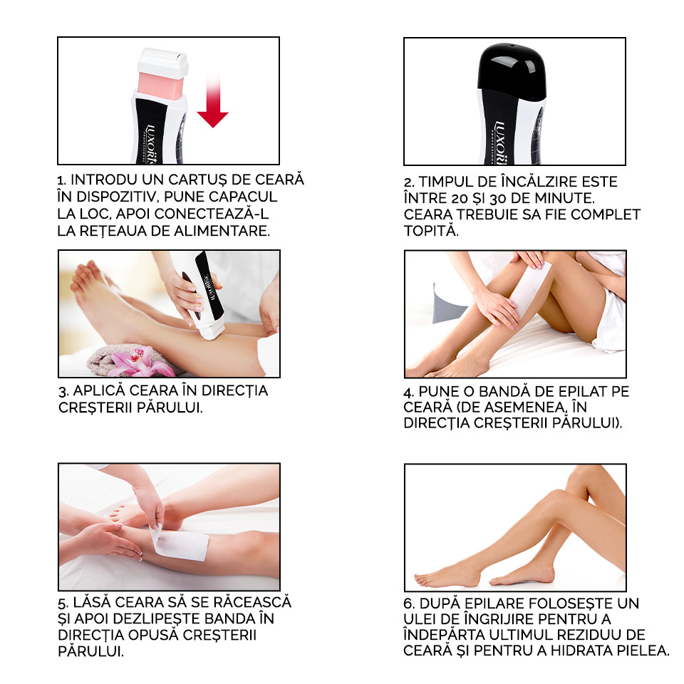 Incalzitor ceara profesional dublu cu suport Dual Care Ultimate - LUXORISE dispune de cablu alimentare 240 V, are un suport dock dublu si 2 incalzitoare ceara, fiind perfect pentru uz personal si profesional! Incalzitorul de ceara Dual Care Ultimate - LUXORISE are un maner din cauciuc rezistent la caldura, este un incalzitor portabil, si este ideal pentru transport. Incalzitorul de ceara dispune de un control automatizat al temperaturii, permitand astfel obtinerea unui efect profesional de ceara. Specificatii : Culoare disponibila: Negru Putere: 40W Model: LUX-200DUO Material: ABS Dimensiune baza 18 x 16 x 5.6 cm Dimensiune incalzitor :7 x 4.5 x 20 cm Greutate: 560 g Tensiune alimentare: 220 - 240V 50 Hz Pachetul contine: 2 buc x incalzitor ceara 1 buc x baza incarcare dubla 1 buc x cablu de incarcare 1 buc x manual de utilizare Respectati intotdeauna modul de utilizare. Mod de utilizare: 1.Incepe prin curatarea pielii cu Lotiune inainte de Epilare SensoPRO Milano . Asigura-te ca pielea este complet uscata inainte de aplicarea cerii. 2. Conecteaza baza incalzitorului la priza cu ajutorul cablului de alimentare 3. Introdu 1-2 rezerve de ceara in incalzitor, asaza incalzitoarele pe baza si asigura-te ca sunt bine conectate. 4. Porneste incalzitoarele cu ajutorul butoanelor ON/OFF si asteapta 20-30 de minute pentru ca ceara sa fie topita complet (supravegheaza constant ceara in momentul incalzirii). Rezerva de ceara contine un roll-on detasabil. Inainte de aplicare, asigurati-va ca acest roll-on este fixat bine. Distribuie uniform ceara pe roll-on cu ajutorul unei benzi de epilare, trecand de 3-4 ori cu roll-on-ul peste aceasta pentru a asigura o aplicare uniforma. 5. Asigura-te ca temperatura cerii este confortabila pentru piele. Poti face un test pe o mica portiune a pielii pentru a evita arsurile. 6. Intinde ceara pe zona dorita în directia de crestere a firelor de par, aplicand un strat subțire și uniform pentru a asigura o epilare eficientă (in cazul in care ceara a inceput sa se raceasca/intareasca, reasaza incalzitorul pe baza pentru cateva minute pana cand ceara ajunge la temperatura dorita). 7. Aplica imediat o banda de epilare deasupra cerii (lasand loc de prindere). Preseaza usor si apoi trage banda rapid in sens invers cresterii firelor de par. Repeta acest proces pe toate portiunile de piele pe care doresti sa le epilezi. 8. Aplica Ulei dupa Epilare pentru indepartarea resturilor de ceară și pentru a calma pielea. Evita expunerea la soare sau la bai fierbinti timp de cateva ore dupa epilare pentru a preveni iritatiile suplimentare. 9. Dupa utilizare apasa butoanele ON/OFF pentru a oprii incalzitoarele si scoate aparatul din priza. Ceara se foloseste exclusiv pentru uz extern. A nu se aplica pe piele sensibila, afectata de leziuni sau pe zone sensibile. A nu se lasa la indemana copiilor . A se evita supraincalzirea. Se recomanda incalzirea precauta . ATENTIE: foarte fierbinte, poate cauza arsuri! Conditii de pastrare: Nu lasati cartusul de ceara deschis si nefolosit pentru perioade mari de timp. A se pastra in spatii reci, uscate si aerisite, ferite de lumina directa a soarelui, a umezelii , a materialelor cu potential agresiv, eventuale lovituri, zgarieturi sau deformari. Se beneficiaza de garantia legala de conformitate asa cum aceasta este reglementata de dispozitiile Legii nr. 296/2004 privind Codul Consumului, cu modificarile si completarile ulterioare coroborate cu dispozitiile OUG nr. 140/2021 privind vanzarea produselor si garantiile asociate acestora, cu modificarile si completarile ulterioare.