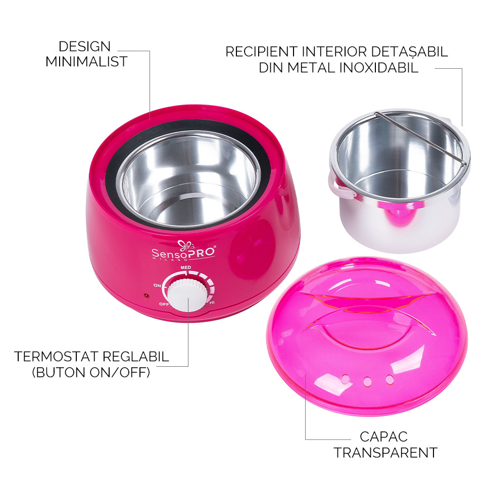 Incalzitor Ceara Profesional PRO WAX 150 SensoPRO Milano, roz, 500ml este perfect pentru o epilare ULTRA-rapida cu ceara traditionala! Incalzitorul are capacitate de 500 ml si dispune de termostat. Butonul rotativ poate seta temperatura in modul de mediu sau inalt. Foloseste cea mai inalta treapta pentru a topi ceara ULTRA-rapid. Este un decantor ideal pentru ceara elastica, traditionala in forma de granule, discuri sau tableta. Galetusa detasabila se pune in cuva incalzitorului si poate fi scoasa in timpul sesiunii de epilare fara a murdari interiorul aparatului. Specificatii : Capacitate: 500 ml Putere: 100 W Tensiune alimentare: 220-240V 50Hz Material: ABS & Aluminiu Culoare: Roz Dimensiune: 19x 14 cm Greutate: 570 g Model: SP-150 PRO Pachetul contine : 1 buc x Incalzitor ceara electric 1 x Galetusa 1 x Capac 1 buc x Manual de utilizare Respectati intotdeauna modul de utilizare. Mod de utilizare: Epilare cu ceara: 1. Asaza incalzitorul pe o suprafata dreapta si rezistenta la temperatura; 2. Asigura-te ca rotita incalzitorului este pe pozitia OFF, apoi conecteaza incalzitorul la priza; 3. Toarna cantitatea de ceara dorita in recipientul incalzitorului si pune capacul; 4. Seteaza incalzitorul la temperatura maxima cu ajutorul rotitei si încalzeste ceara pana devine complet lichida, apoi pastreaz-o constant la o temperatura medie. Amesteca din cand in cand pentru a verifica soliditatea, ceara este gata de aplicare cand devine cremoasa (supravegheati constant ceara in momentul incalzirii). 5. Asigura-te ca temperatura cerii este confortabila pentru pielea ta. Poti face un test pe o mica portiune a pielii pentru a evita arsurile. 6. Incepe prin curatarea pielii cu Lotiunea înainte de Epilare SensoPRO Milano . Asigura-te ca pielea este complet uscata inainte de aplicarea cerii. 7. Foloseste o spatula pentru a aplica ceara in directia cresterii firelor de par, asteapta cateva secunde pentru a se întari ceara si apoi trage rapid in sens invers cresterii firelor de par. 8. Aplica Ulei dupa Epilare pentru a indeparta reziduurile de ceara si pentru a reduce roseata si iritatiile pielii. Evita expunerea la soare sau la bai fierbinti timp de cateva ore dupa epilare pentru a preveni iritatiile suplimentare. 9. Dupa utilizare, deconecteaza incalzitorul de la priza si curata-l pentru a indeparta resturile de ceara cazute pe acesta. Tratament cu parafina: 1. Asaza încalzitorul pe o suprafata dreapta si rezistenta la temperatura; 2. Asigura-te ca rotita incalzitorului este pe pozitia OFF, apoi conecteaza incalzitorul la priza. 3. Portioneaza parafina si asaza cantitatea dorita în recipientul încalzitorului, apoi pune capacul. 4. Seteaza incalzitorul la temperatura maxima cu ajutorul rotitei si incalzeste parafina pana cand aceasta devine complet lichida, apoi seteaza încalzitorul la temperatura medie si astepta ca temperatura parafinei sa fie confortabila pentru pielea ta. Poti face un test pe o mica portiune a pielii pentru a evita arsurile (supravegheati constant ceara in momentul incalzirii). 5. Inainte de aplicarea parafinei trebuie sa: dezinfectezi zona dorita, sa masezi usor cu o crema exfolianta si sa clatesti cu apa calduta, apoi aplica un strat gros de crema hidratanta si maseaza usor. 6. Cand parafina ajunge la temperatura dorita, aplica pe zona dorita cu o pensula/spatula speciala pentru parafina. 7. Dupa acoperirea completa cu parafina, introdu manile/picioarele mai intai intr-o manusa/soseta de unica folosinta, apoi in manusile/sosetele din bumbac pentru parafina. 8. Asteapta 30min. si îndeparteaza parafina. 9. La final aplica un strat de crema hranitoare și maseaza usor. 10. Curatarea incalzitorului se face cu ajutorul unui servetel, cat timp parafina este înca lichida. Ceara si parafina se folosesc exclusiv pentru uz extern. A nu se aplica pe piele sensibila, afectata de leziuni sau pe zone sensibile. A nu se lasa la indemana copiilor . A se evita supraincalzirea. Se recomanda incalzirea precauta. ATENTIE : foarte fierbinte, poate cauza arsuri! Conditii de pastrare: Nu lasati produsul (ceara sau parafina) deschis si nefolosit pentru perioade mari de timp. A se pastra in spatii reci, uscate si aerisite, ferite de lumina directa a soarelui, a umezelii , a materialelor cu potential agresiv, eventuale lovituri, zgarieturi sau deformari. Se beneficiaza de garantia legala de conformitate asa cum aceasta este reglementata de dispozitiile Legii nr. 296/2004 privind Codul Consumului, cu modificarile si completarile ulterioare coroborate cu dispozitiile OUG nr. 140/2021 privind vanzarea produselor si garantiile asociate acestora, cu modificarile si completarile ulterioare. Ceara traditionala din imaginile secundare este cu titlu de prezentare si se achizitioneaza separat!