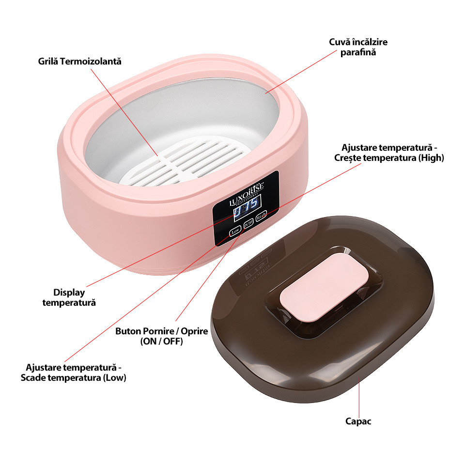 Incalzitor Parafina Profesional iTouch SPA 360 LUXORISE 2000ml, roz este un dispozitiv de ultra performant cu display digital si butoane touch, folosit in saloanele de infrumusetare, dar potrivit si pentru confortul propriei case. Aparatul topeste parafina rapid si uniform. Atunci cand parafina a ajuns la temperatura optima, incalzitorul te va anunta prin intermediul ecranului digital. Tehnologia moderna permite setarea digitala a temperaturii. In plus, caldura va fi conservata pentru a mentine parafina intr-o stare lichida mai mult timp. Capacul transparent protejeaza parafina de praf si alte particule si va permite sa supravegheati topirea. Pachetul contine: 1 buc x Incalzitor parafina 1 buc x Manual de utilizare 1 buc x Grila termoizolanta Specificatii tehnice: Culoare: Roz Cod : LUX-2000ITS Display Digital Butoane Touch Temperatura maxima: 75° C Material: ABS & aluminiu Capacitate: 2000 ml Putere: 200W Greutate : 1000g Tensiune alimentare: 220V Dimensiuni: 32 x 27 x 17 cm Mod de utilizare: 1. Asaza încalzitorul pe o suprafata dreapta si rezistenta la temperatura; 2. Asigura-te ca butonul incalzitorului este pe pozitia OFF, apoi conecteaza incalzitorul la priza. 3. Portioneaza parafina si asaza cantitatea dorita în recipientul încalzitorului, apoi pune capacul. 4. Seteaza incalzitorul la temperatura maxima si incalzeste parafina pana cand aceasta devine complet lichida, apoi seteaza încalzitorul la temperatura medie si astepta ca temperatura parafinei sa fie confortabila pentru pielea ta. Poti face un test pe o mica portiune a pielii pentru a evita arsurile. Nu lasati aparatul nesupravegheat in timpul functionarii! 5. Inainte de aplicarea parafinei trebuie sa: dezinfectezi zona dorita, sa masezi usor cu o crema exfolianta si sa clatesti cu apa calduta, apoi aplica un strat gros de crema hidratanta si maseaza usor. 6. Cand parafina ajunge la o temperatura suportabila, aplica pe zona dorita cu o pensula/spatula speciala pentru parafina (in cazul in care se foloseste doar pentru uz personal, poti introduce mana/piciorul direct in cuva incalzitorului insa Atentie! Nu atinge baza incalzitorului este foarte fierbinte, foloseste Grila termoizolanta ). 7. Dupa acoperirea completa cu parafina, introdu manile/picioarele mai intai intr-o manusa/soseta de unica folosinta, apoi in manusile/sosetele din bumbac pentru parafina. 8. Asteapta 30min. si îndeparteaza parafina. 9. La final aplica un strat de crema hranitoare și maseaza usor. 10. Curatarea incalzitorului se face cu ajutorul unui servetel, cat timp parafina este înca lichida. A nu se folosii de catre persoanele cu sensibilitate. Parafina se foloseste exclusiv pentru uz extern. A nu se aplica pe piele sensibila, afectata de leziuni sau pe zone sensibile. A nu se lasa la indemana copiilor. A se evita supraincalzirea. Se recomanda incalzirea precauta. ATENTIE: foarte fierbinte, poate cauza arsuri! Conditii de pastrare: Nu lasati produsul deschis si nefolosit pentru perioade mari de timp. A se pastra in spatii reci, uscate si aerisite, ferite de lumina directa a soarelui, a umezelii , a materialelor cu potential agresiv, eventuale lovituri, zgarieturi sau deformari. Se beneficiaza de garantia legala de conformitate asa cum aceasta este reglementata de dispozitiile Legii nr. 296/2004 privind Codul Consumului, cu modificarile si completarile ulterioare coroborate cu dispozitiile OUG nr. 140/2021 privind vanzarea produselor si garantiile asociate acestora, cu modificarile si completarile ulterioare.