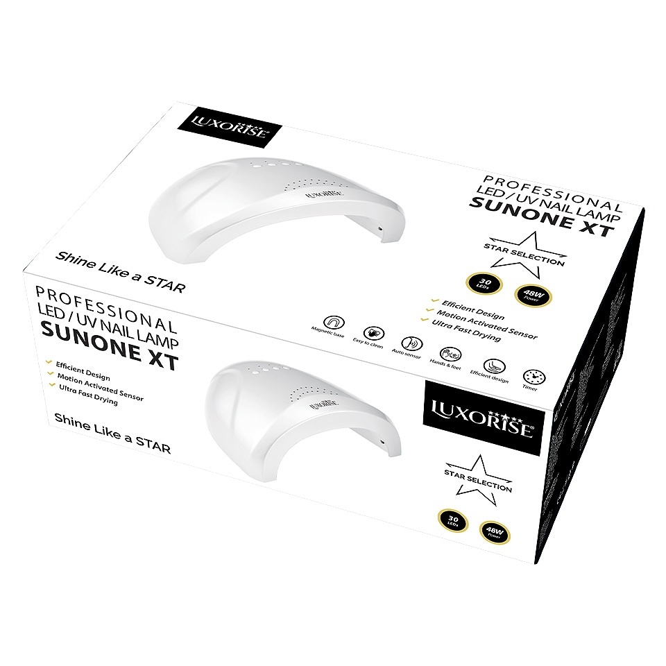 Lampa UV LED 48W SUNONE XT - LUXORISE este o lampa de calitate cu LED-uri de tip DOUBLE Light LED (365nm + 405nm), culoare Alb. SUNONE XT - LUXORISE este potrivita pentru polimerizarea manichiurilor si pedichiurilor realizate cu gel UV, polygel sau oja semipermanenta. Aparatul este dotat cu senzor de prezenta si timer ce se poate seta la 5s/30s/60s. Atunci cand introduci mana in lampa ea porneste automat si functioneaza timp de 90 secunde. O alta modalitate de pornire a lampii este prin apasarea butonului On/Off (in acest caz, lampa functioneaza timp de 90 secunde). Apasati butonul On/Off timp de 2 secunde pentru a comuta intre 24 si 48 W (ledul de power sta aprins cand este selectat 24W). Pachetul contine: 1 x Lampa UV LED 1 x Alimentator 1 x Manual de utilizare Specificatii: 30 leduri Putere maxima consumata:48W Tensiune alimentare 100-240V 50/60 Hz Dimensiune: 20x16x8.5 cm Lungime de unda: 365+405nm Cod produs SUNEONE XT Culoare: Alb Greutate: 329 g Respectati intotdeauna modul de utilizare. Mod de utilizare: 1. Conectati lampa la priza cu ajutorul cablului de alimentare. 2. Dupa aplicarea produselor care necesita polimerizare, introduceti mana in lampa pentru a o pornii cu ajutorul senzorului de miscare timp de 120sec sau apasati unul dintre butoanele de timer: 5s, 30s, 60s. Apasati butonul On/Off pentru a comuta intre 24 si 48 W (LED-ul de power sta aprins cand este selectat 24W). Oricare dintre cele 3 programe de timer pot fi folosite impreuna cu functia butonului ON/OFF. 3. Selectati timpul de uscare specific produselor utilizate. ATENȚIE! A nu se folosii de persoanele cu sensibilitate ! Se beneficiaza de garantia legala de conformitate asa cum aceasta este reglementata de dispozitiile Legii nr. 296/2004 privind Codul Consumului, cu modificarile si completarile ulterioare coroborate cu dispozitiile OUG nr. 140/2021 privind vanzarea produselor si garantiile asociate acestora, cu modificarile si completarile ulterioare.