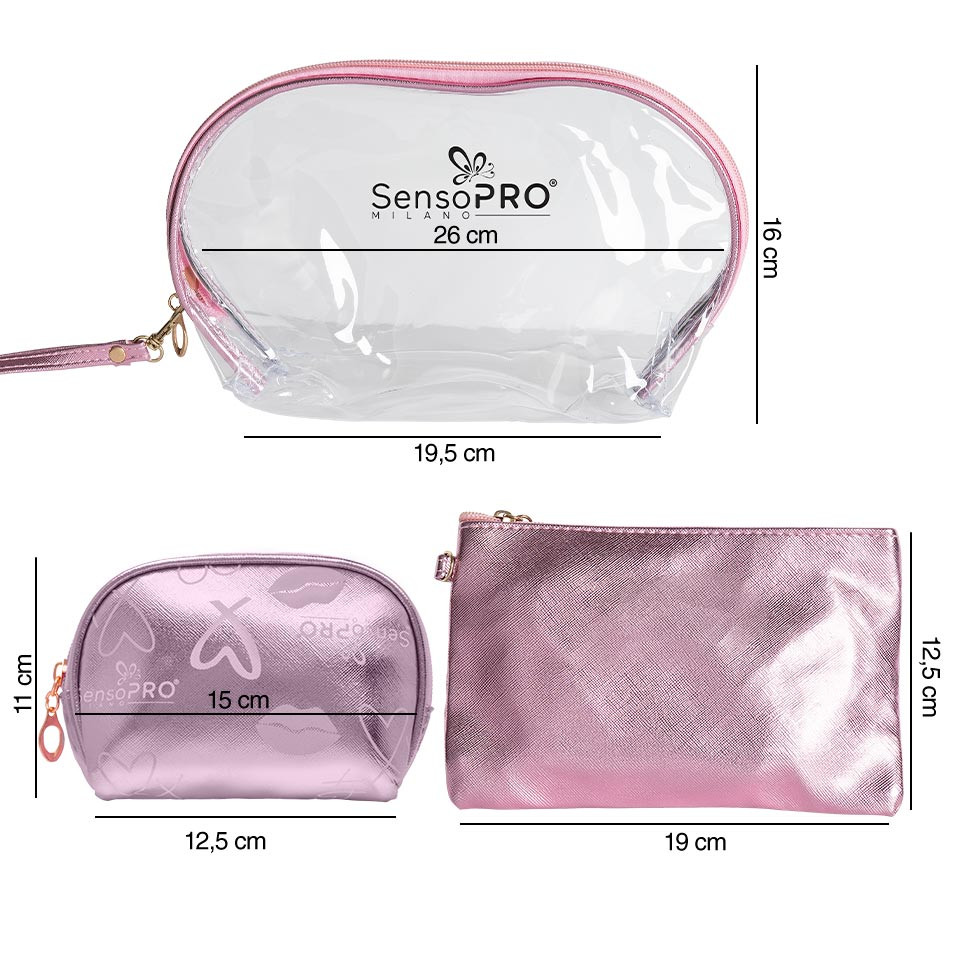 Portfard Travel Transparent & Pink, SensoPRO Liberty, set 3 buc este perfect pentru calatorii. Gentile cosmetice sunt realizate din materiale de calitate premium, rezistente in timp, usor de curatat. Portfardurile Liberty sunt un accesoriu versatil, extrem de util atat pentru vacante cat si pentru transportul zilnic al produselor cosmetice. Portfardurile sunt dotate cu un fermoar metalic foarte rezistent. Alege sa-ti transporti in siguranta colectia de beauty! Dimensiuni: - portfard mic: 11x15x12.5cm. - portfard mediu: 19x12.5cm. - portfard mare: 26x19.5x16cm. Atentie!!! Produsele din imaginile secundare sunt cu titlu de prezentare si nu sunt incluse in pret!