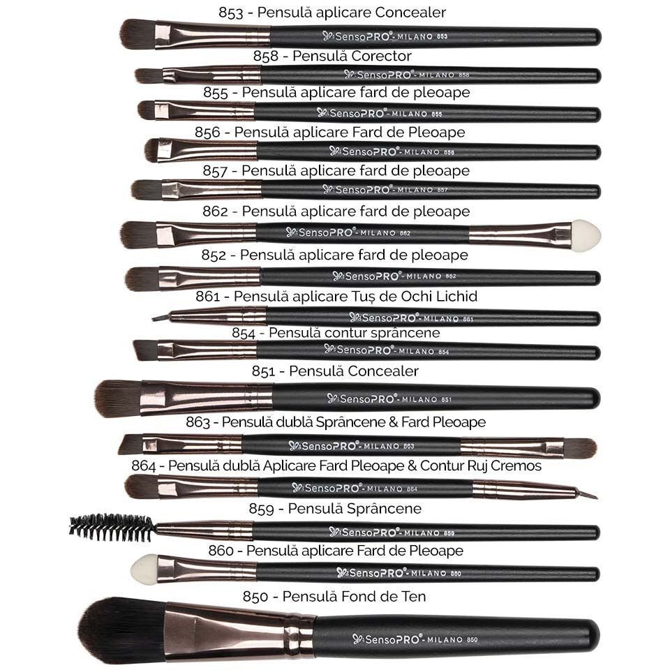 Set 15 Pensule Machiaj Profesionale SensoPRO Milano Travel Black + CADOU iti va transforma complet rutina de make-up! Materialele de calitate superioara te vor ajuta sa iti creezi un machiaj perfect, de fiecare data! Perii sunt rezistenti, fini si ajuta la blenduirea perfecta a produsului de beauty pe piele. Au o textura matasoasa la atingere si nu lasa urme de produs in timp ce lucreaza. Setul contine pensule potrivite unui machiaj complet: 15 de pensule de make-up dintre care 3 pensule duble. Au grija de fiecare etapa a machiajului tau: 853 - Pensula aplicare Concealer 858 - Pensula Corector 855 - Pensula aplicare Fard de Pleoape 856 - Pensula aplicare Fard de Pleoape 857 - Pensula aplicare Fard de Pleoape 862 - Pensula aplicare Fard de Pleoape 852 - Pensula aplicare Fard de Pleoape 861 - Pensula aplicare Tus de Ochi Lichid 854 - Pensula contur Sprancene 851 - Pensula Concealer 863 - Pensula dubla Sprancene & Fard Pleoape 864 - Pensula dubla Aplicare Fard Pleoape & Contur Ruj Cremos 859 - Pensula Sprancene 860 - Pensula aplicare Fard de Pleoape 850 - Pensula Fond de Ten Cu ajutorul Set 15 Pensule Machiaj Profesionale SensoPRO Milano Travel Black + CADOU vei obtine un make-up perfect in fiecare zi, fiecare aplicare fiind fara cusur! Avantaje Pensule SensoPRO Milano Travel: - Cadou Saculet depozitare - Delicate, rezistente - Par natural & sintetic - Manere confortabile din lemn - Calitate garantata - Potrivite pentru machiaj ochi, sprancene, fata, buze
